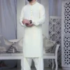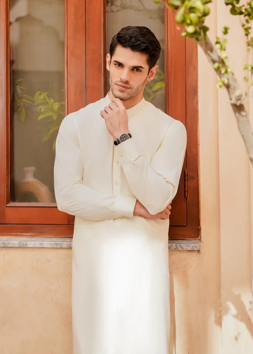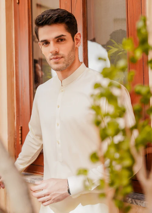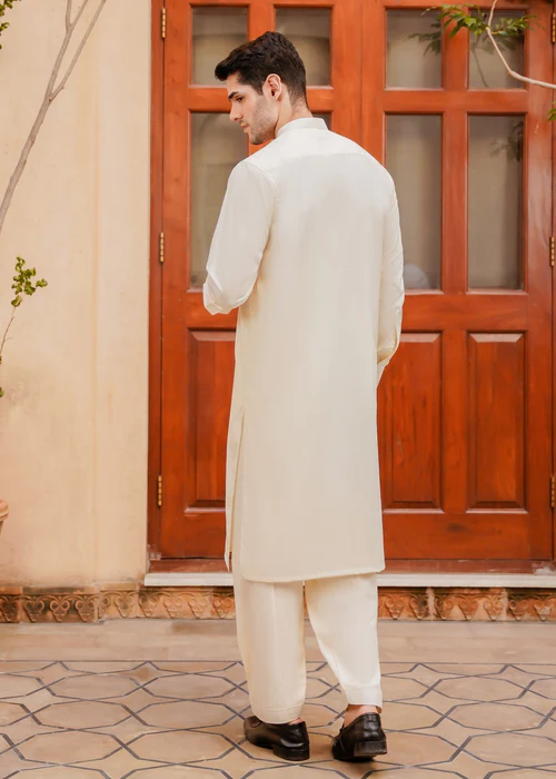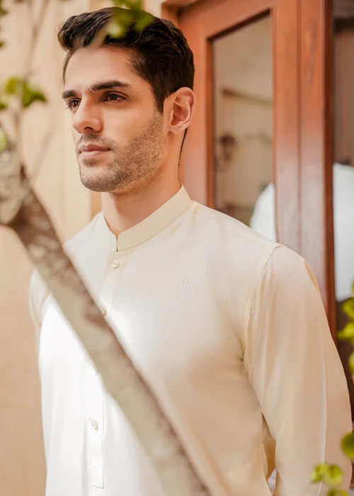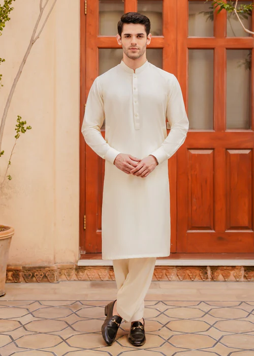 Simple yet elegant, our blended fabric shalwar kameez combines traditional design with a modern touch, offering a timeless and versatile look. The durable and comfortable fabric makes it ideal for any occasion, ensuring both style and practicality. Featuring a straight silhouette, a traditional band collar, and buttoned cuffs, it is perfectly coordinated with a classic shalwar, creating a refined and sophisticated ensemble.