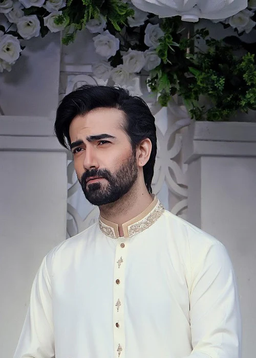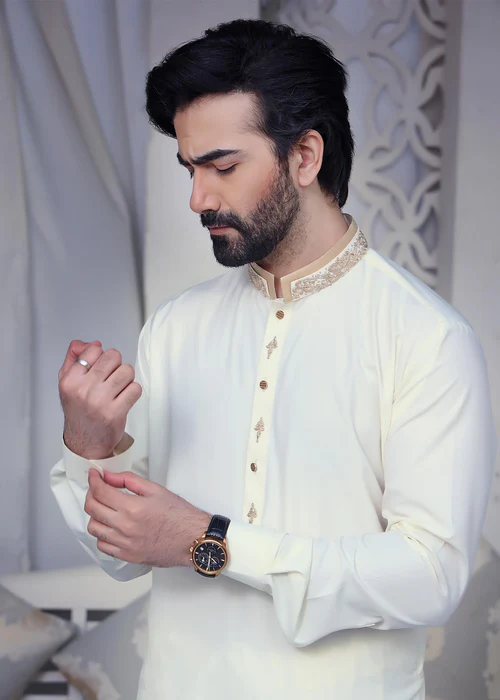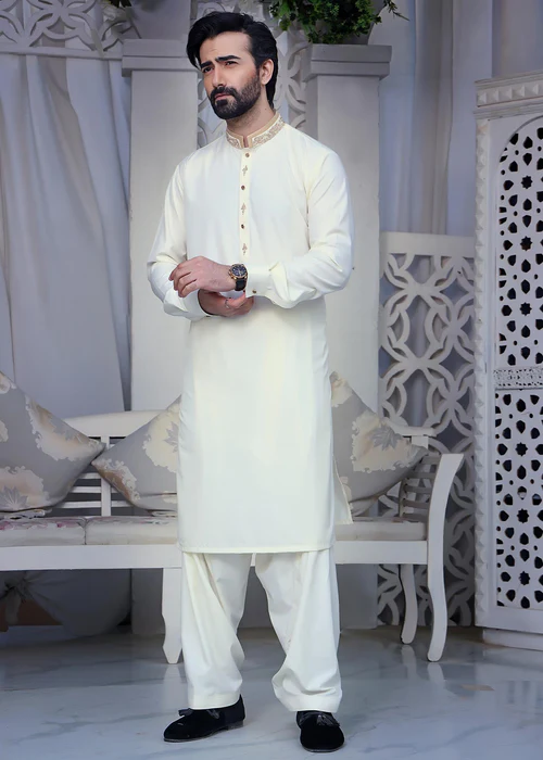 Men’s Formal Kameez Shalwar with Hand Embroidery on Collar and Front